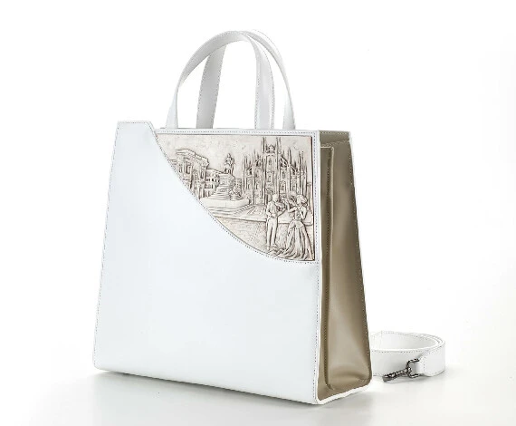 The sculptural beauty of a unique accessory.Clean and geometric lines, embellished with marble dust bas-reliefs.City Collection is the line that pays homage to Italy by depicting, in its bas-reliefs, some of the most iconic places in the country: the Milan Cathedral, Piazza di Spagna and the Rialto Bridge in Venice. White or black, handmade, 100% Made in Italy, it is a bag that focuses on the innate elegance of classic shapes, and on a prestigious detail. The “clean style” with a trapezoidal profile, and the possibility of adding the shoulder strap, make it the ideal bag for an elegant occasion but also for free time. A unique and exclusive accessory that embraces the world of Italian fashion and art. City Collections are numbered, in a limited edition.